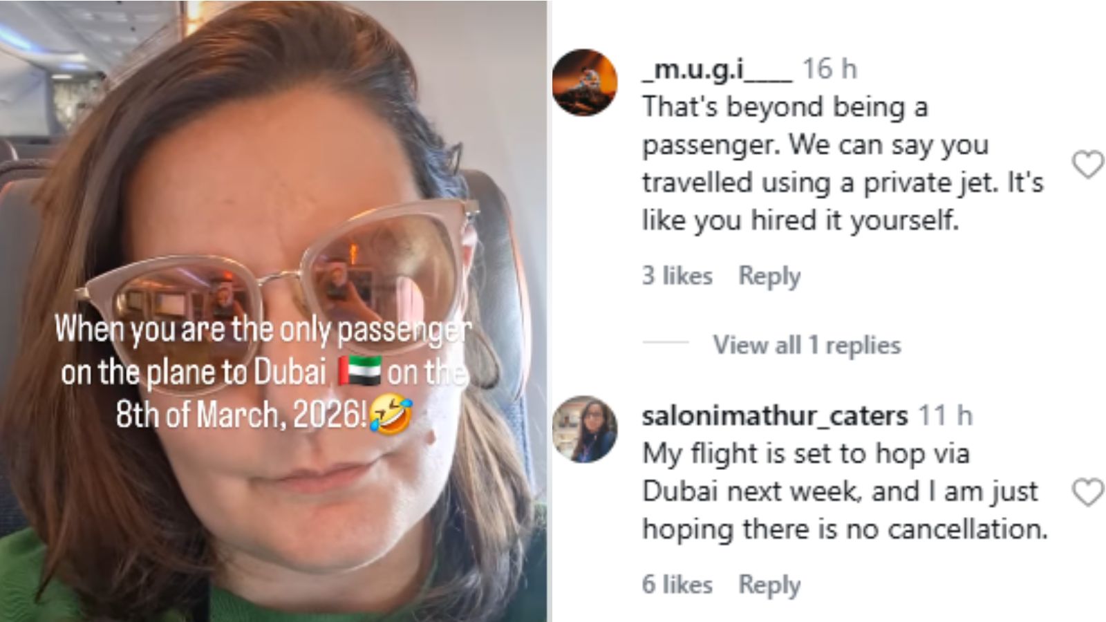 The on-screen text in the video reads: “When you’re the only passenger on the plane to Dubai on March 8, 2026!” followed by a laughing emoji.