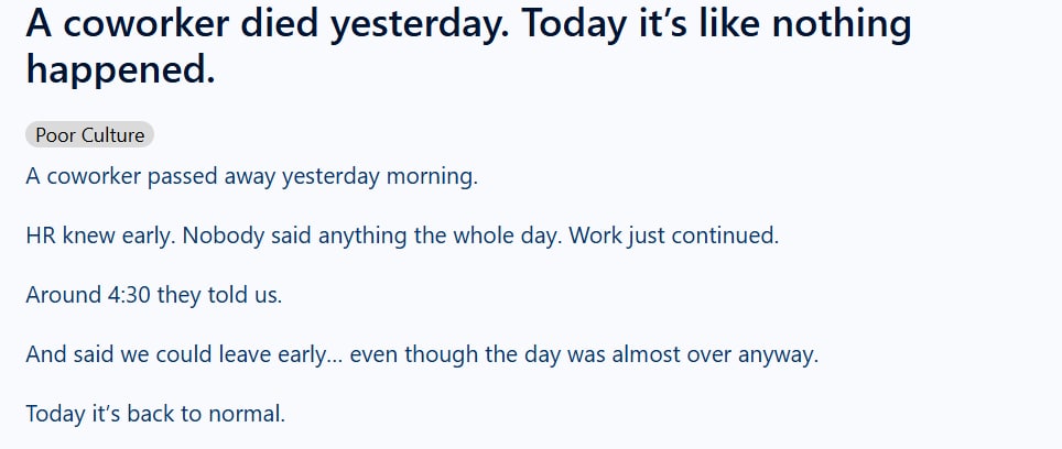 The employee then explains what happened in detail. “One of my co-workers died yesterday morning. HR found out early. No one said anything all day. Work just kept going. About 4:30 they told us. They said we could leave early… even though the day was almost over anyway.”
