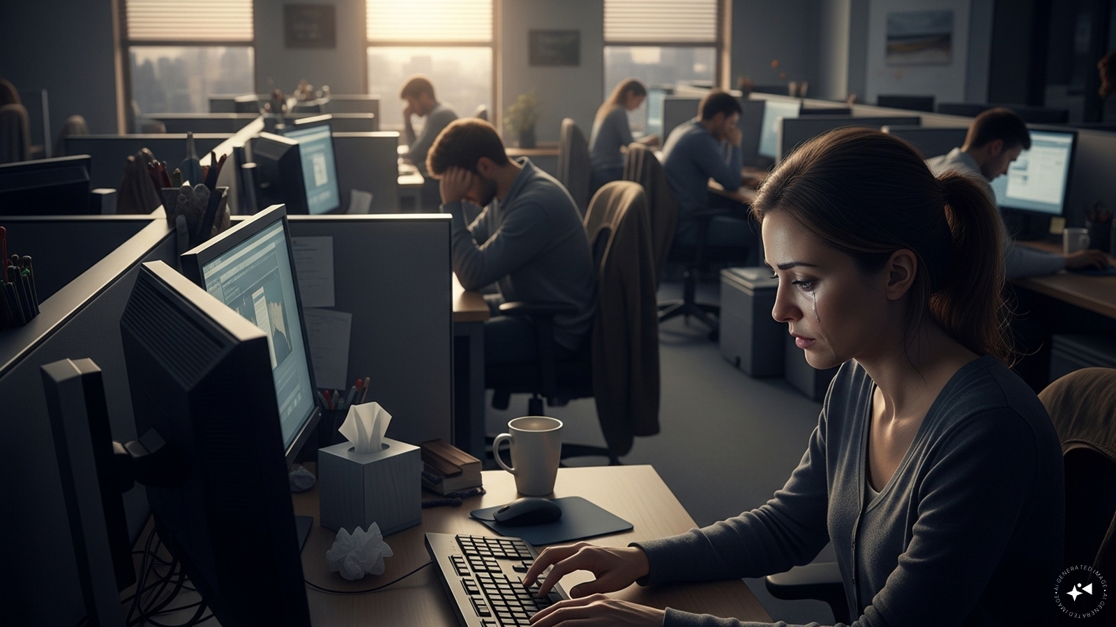 An employee calls out from the workplace after the death of a colleague: “Some people cry quietly, but they still work.” Credit: Created by artificial intelligence