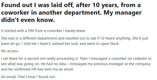 The employee then revealed that he never received any official email – unsure if it had arrived in spam or just hadn’t arrived yet. However, he was reading the news of his termination from a former manager who was sitting at his house at nine in the morning. Seeking clarification, he messaged his direct manager on LinkedIn. When the manager responded by saying, “Sorry to hear that,” it made him even more frustrated, and it felt like a cold formality at the company. The story took an unexpected turn when the manager texted back – he too had been laid off.