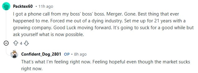 Another user commented, “I got a phone call from my boss’s boss. Merger. Best thing that ever happened to me. Forced out of a dying industry. Set me up for 21 years with a growing company. Good luck moving forward.”
