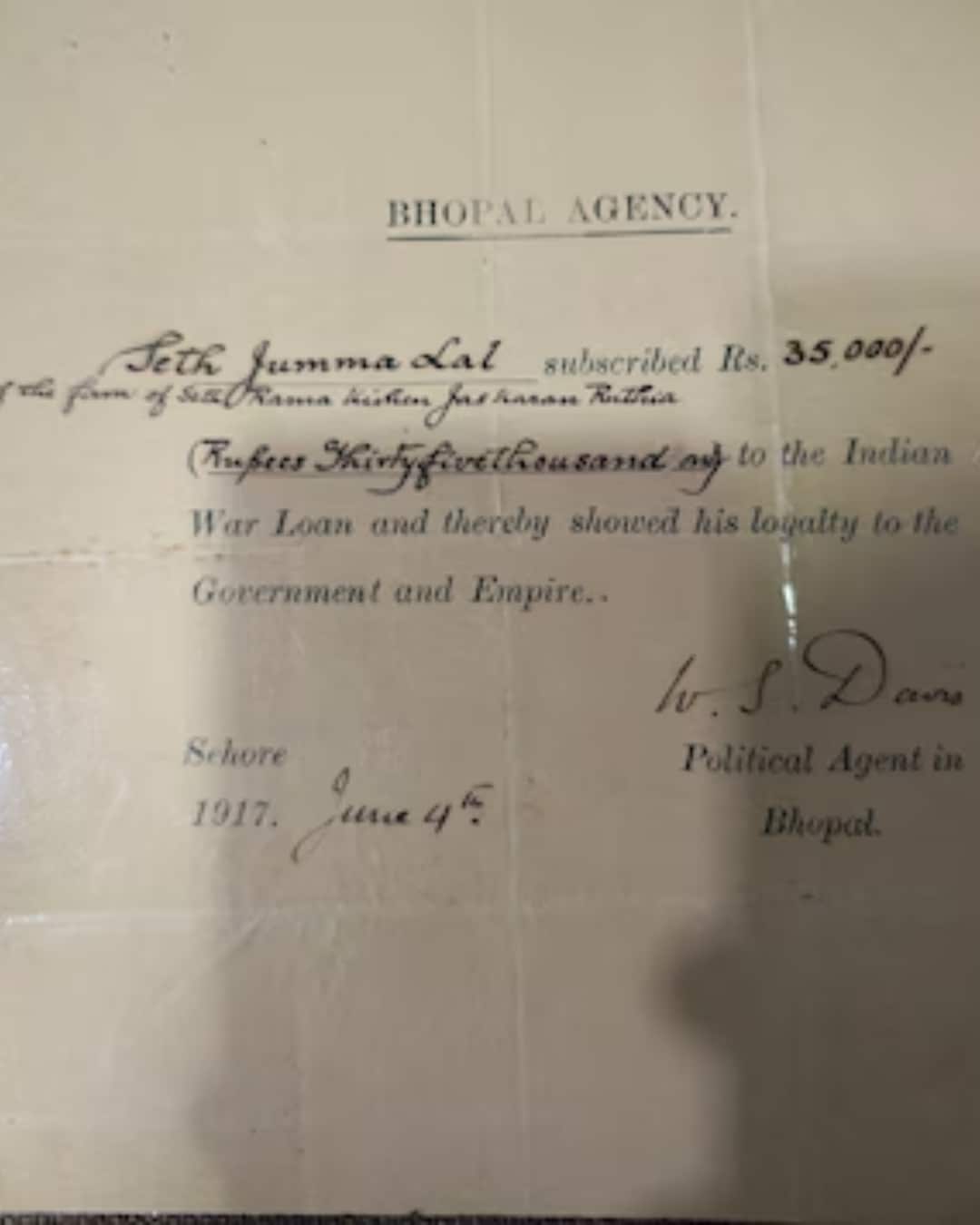 According to the information shared by the family, Seth Guma Lal Ruthia, a well-known businessman from Sihore, loaned Rs 35,000 to the British administration in 1917. At that time, during World War I, the British government was facing severe financial pressure and needed funds urgently.