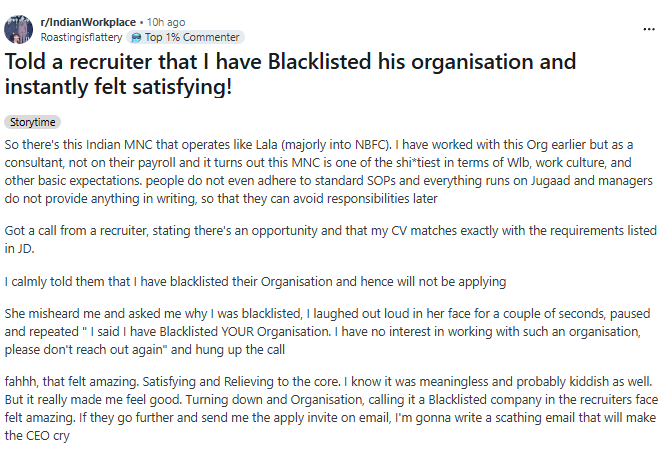 The incident, which was shared on Reddit, struck a chord with professionals frustrated with toxic work cultures. According to the Redditor, a recruiter from an Indian MNC in the NBFC sector reached out saying that his profile was a perfect fit for the role. Instead of politely declining, the candidate gave a shocking response, “You said your organization has been blacklisted. I have no interest in working with such an organization, please do not call again.”