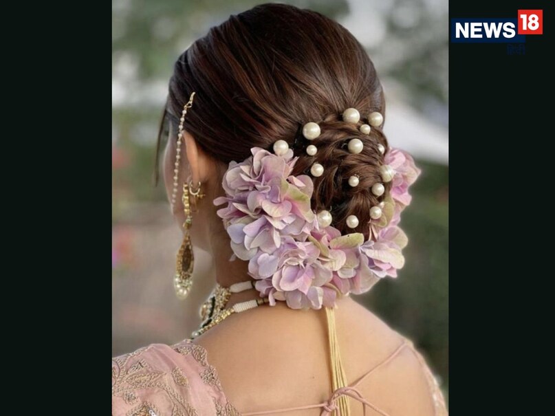 You can make a beautiful hair style with Lehenga or Sarik on Karva Chaute. This hair decorated with pearls and accessories flourishes, and opens more with the sari or lehenga, which is a light shade. If there are jewelry of beads together, what is it up.
